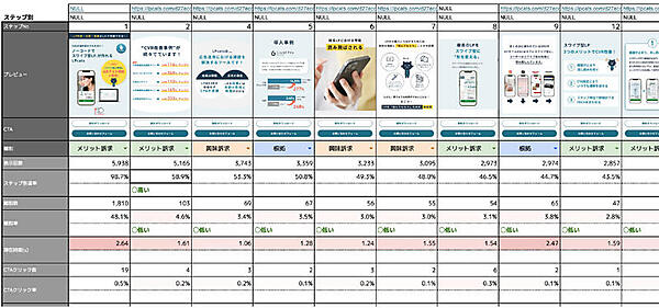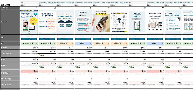 画面ごとの到達率、滞在時間、離脱率、CTAクリック率などを定量的に取得でき、ユーザーの反応をステップ単位で可視化・評価することが可能。これにより、構成全体を俯瞰しながら「必要なところだけを改修する」という、効率的かつ本質的な改善アプローチが実現できるのです。