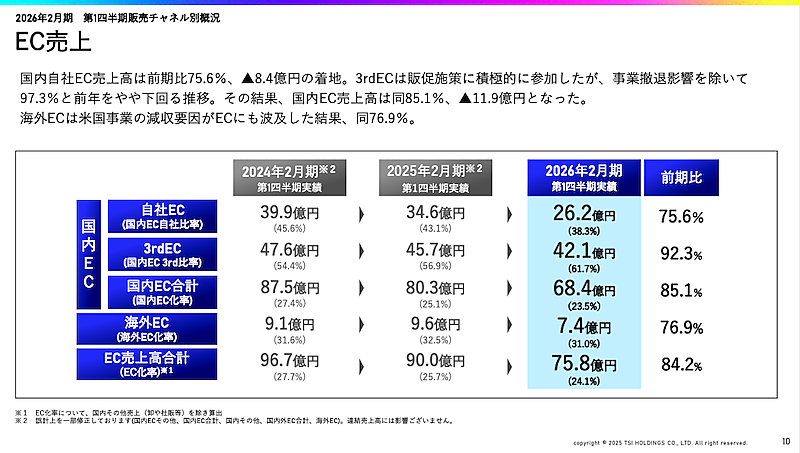 TSIホールディングスの2025年3-5月期(第1四半期)のEC売上高は前年同期比15.8%減の75億8000万円だった。EC化率は24.1%。