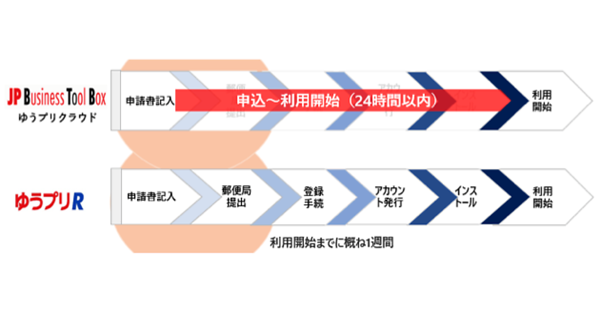 「ゆうプリクラウド」は問い合わせやサービス利用状況の確認などをサポートする法人向けポータルサイト「JP Business ToolBox」の料金後納の顧客番号でログイン後、Web上で申し込みできる。従来の送り状印字ソフト「ゆうプリR」では、郵便局に申込書を提出する必要があったが、「ゆうプリクラウド」はWeb上で申し込み可能。申し込みから24時間以内に利用できる。