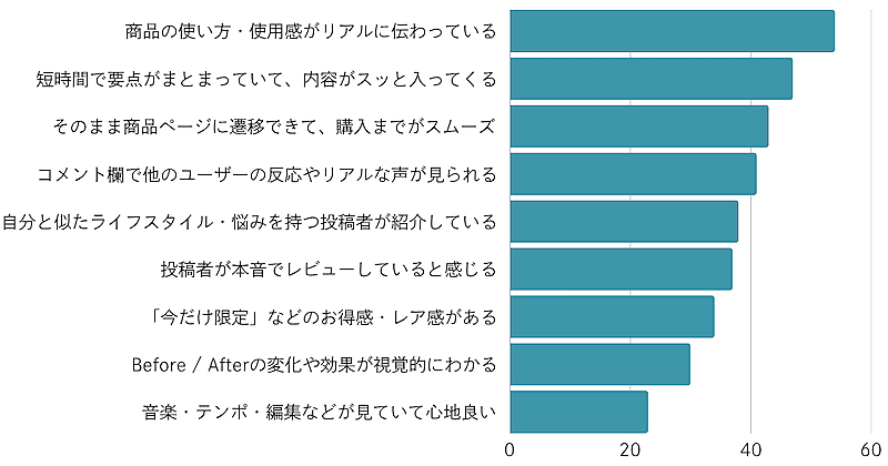 動画プラットフォームで見たことをきっかけに商品・サービスを「買いたくなる」と感じる投稿の特長についても聞いた。「短時間で要点がまとまっていて内容がすっと入る」や「実際に使ってレビューしていることが伝わる」といった“情報のリアルさと即効性”が高く評価されている。