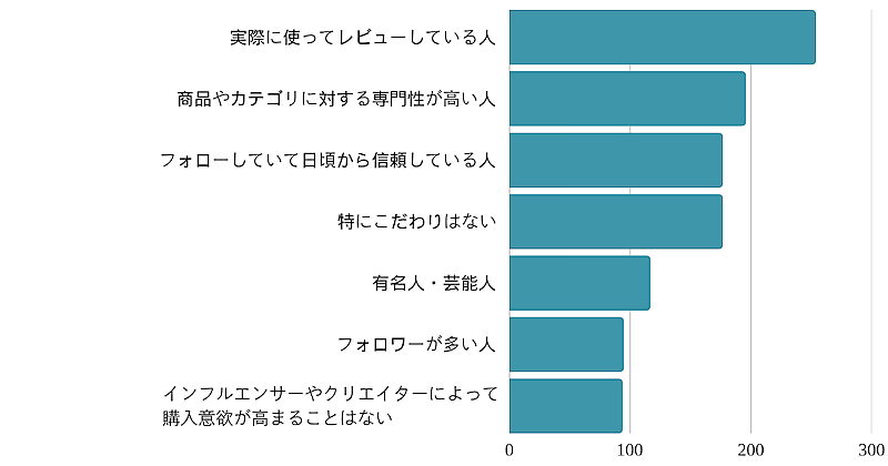 購買意欲を高めるインフルエンサー像は、「フォローしていて日頃から信頼している人」「専門性の高い人」「実際に使ってレビューする人」が上位にあがり、「等身大の存在」「生活に近い存在」への信頼感が、購買行動における最重要因子となっている。一方で、「有名人」「フォロワーが多い人」といった表面的な影響力には関心が集まりにくく、SNSでの購買促進においては、誰が言っているかよりも、どれだけ本音で語られているか・自分と重ねられるかが重要になっていることがわかった。