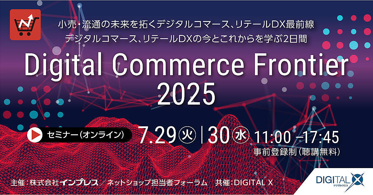 インプレスの『ネットショップ担当者フォーラム』は7月29日(火)+30日(水)、オンラインイベント「Digital Commerce Frontier 2025」を開催します。ZOZO、アスクル、パルコ、スマートニュース、ワコール、アシックスなどの担当者が登壇する全26講演をオンラインで配信します。