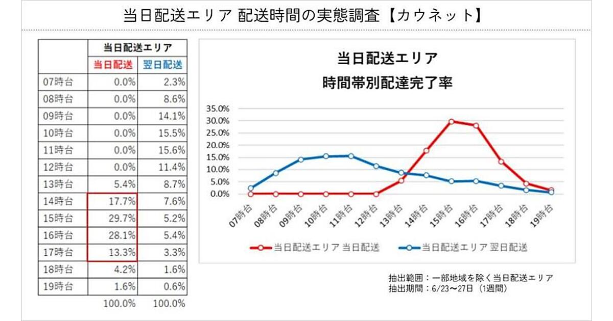 カウネットは一部地域を除く当日配送エリアにおいて、配送時間の実態調査を実施。その結果、当日配送エリアにおける配送は全体の90%以上が18時までに配達完了していたが、当日配送に限定すると14時台から17時台の4時間に88.8%が配達完了となり、配達が集中する傾向にあることがわかった。