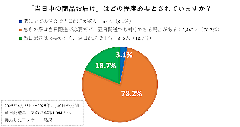 カウネットは当日中の商品配達の必要性を問うアンケートも実施した。その結果、「全ての注文で当日配送が必要」の回答は約3%に留まり、「急ぎの場合は当日配送が必要だが、翌日配送でも対応できる場合がある」の回答が約80%にのぼった。