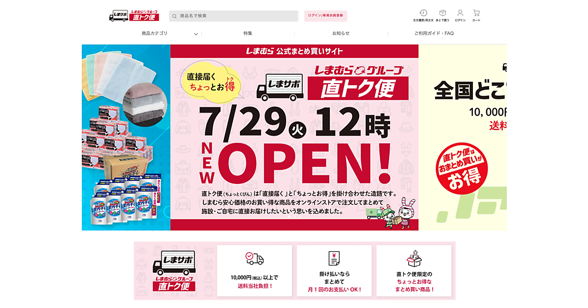 しまむらは7月29日、介護用品や日用品などを取り扱うBtoB-ECサイト「しまサポ直トク便(ちょっとくびん)」をオープンした。
