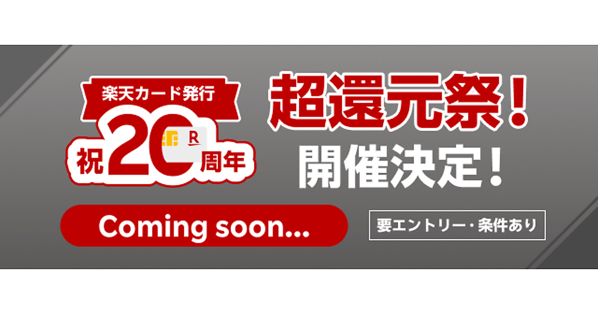 楽天カードは、「楽天カード」発行から20周年を迎えたことを記念した「超還元祭!」キャンペーンを実施すると発表した。キャンペーンの詳細は8月1日に発表予定。
