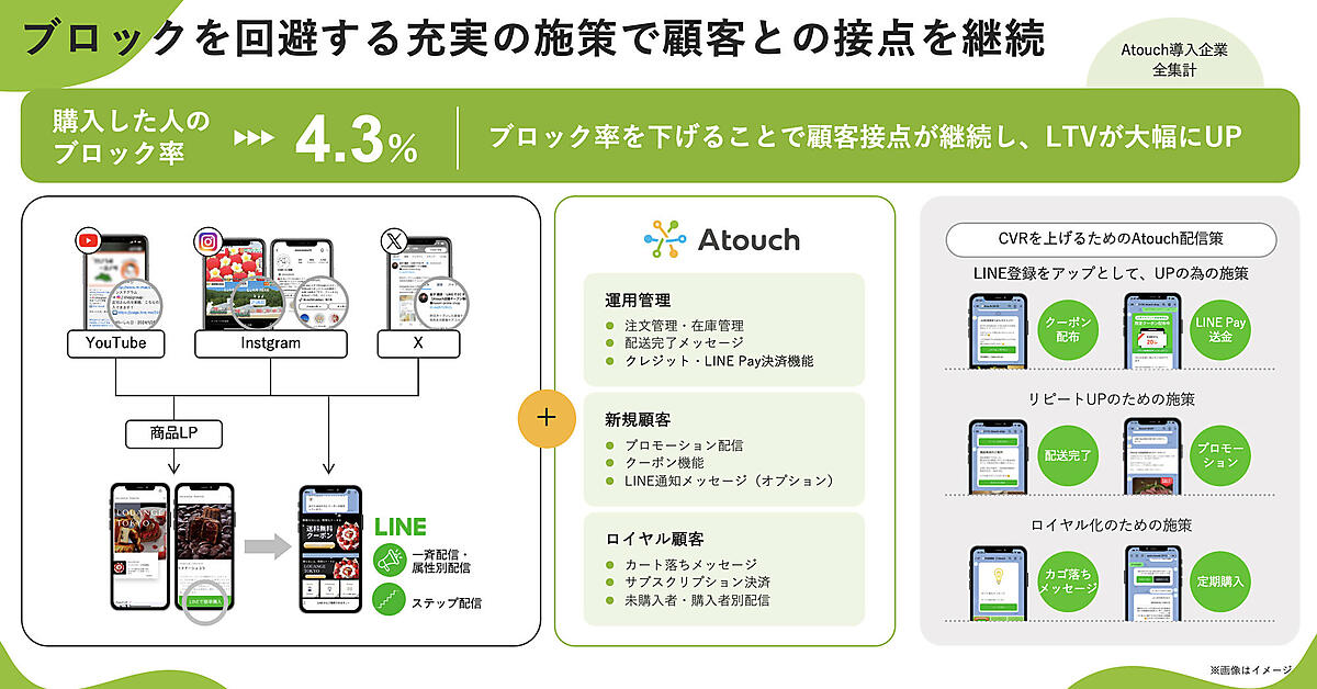 - 圧倒的なブロック率の低さ:1度でも「Atouch」で商品を購入した顧客のブロック率は4.3%。一般的なLINE公式アカウントの平均ブロック率(40~50%)と比較して非常に低い