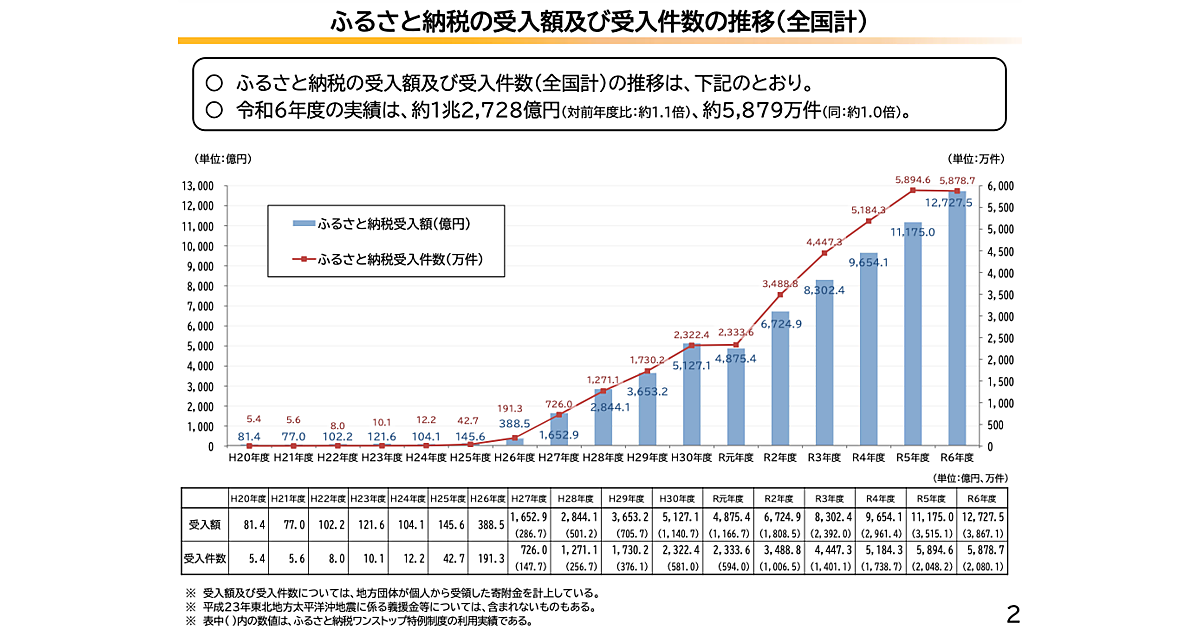 総務省の自治税務局市町村税課は7月31日、「ふるさと納税に関する現況調査結果(令和7年度実施)」を公表、2024年度のふるさと納税受け入れ額は前年度比13.9%増の1兆2727億5000万円と過去最大となった。受け入れ件数は同0.3%減の5878万7000件だった。