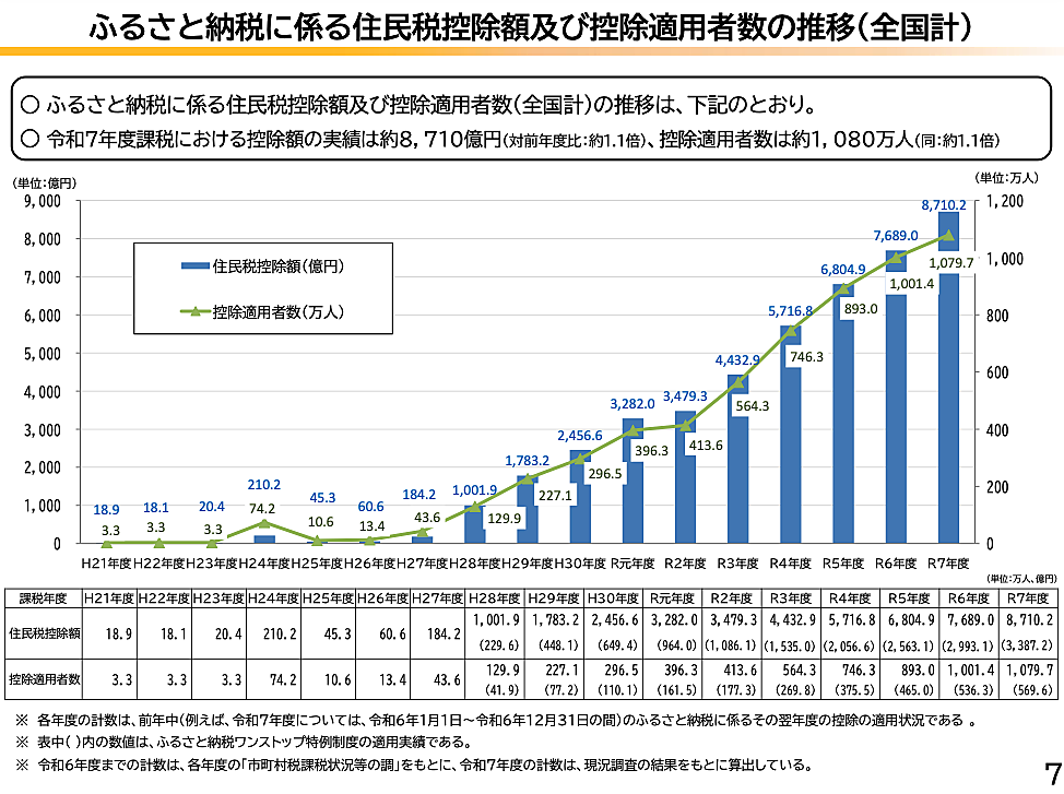 ふるさと納税による住民税控除額と控除適用者数の推移について、2024年度の課税における控除額の実績は前年度比13.3%増の8710億2000万円、控除適用者数は同7.8%増の1079万7000人。