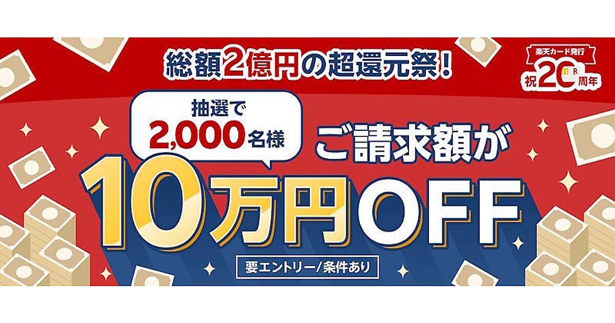 楽天カードは、「楽天カード」発行から20周年を迎えたことを記念した「超還元祭!」キャンペーンについて、抽選で2000名のカード請求額を10万円OFFする総額2億円還元キャンペーンを8月1日から8月31日まで実施すると発表した。