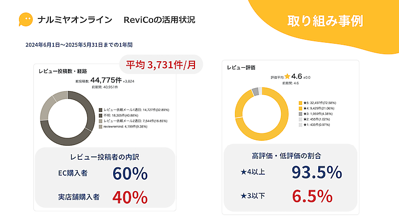 ECサイト「ナルミヤオンライン」にReviCoが提供するレビューマーケティングプラットフォーム「ReviCo」を導入したところ、レビュー閲覧後の購入のCVRは2.6倍になったという。2024年6月1日~2025年5月31日までの1年間のレビュー獲得総数は4万4775件。月平均3731件で、内訳はEC購入者が約6割、実店舗購入者が約4割となっている。