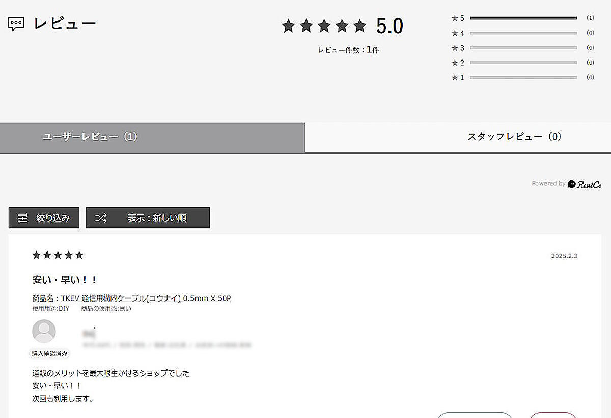 SDSではさらに、BtoB-ECでは珍しく、レビューマーケティングを展開している。他のBtoB-ECサイトではあまり実装されていないレビュー機能。運用してみると、意外にもしっかりとレビューが投稿され、ポジティブな影響を生んでいるという。レビューの多くはサービスに対する評価だ。