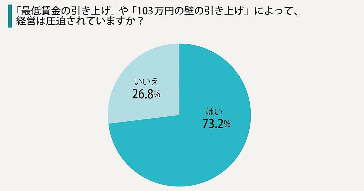「最低賃金の引き上げ」や「103万円の壁の引き上げ」によって、経営は圧迫されているかを聞いたところ、「はい」が73.2%、「いいえ」が26.8%だった。