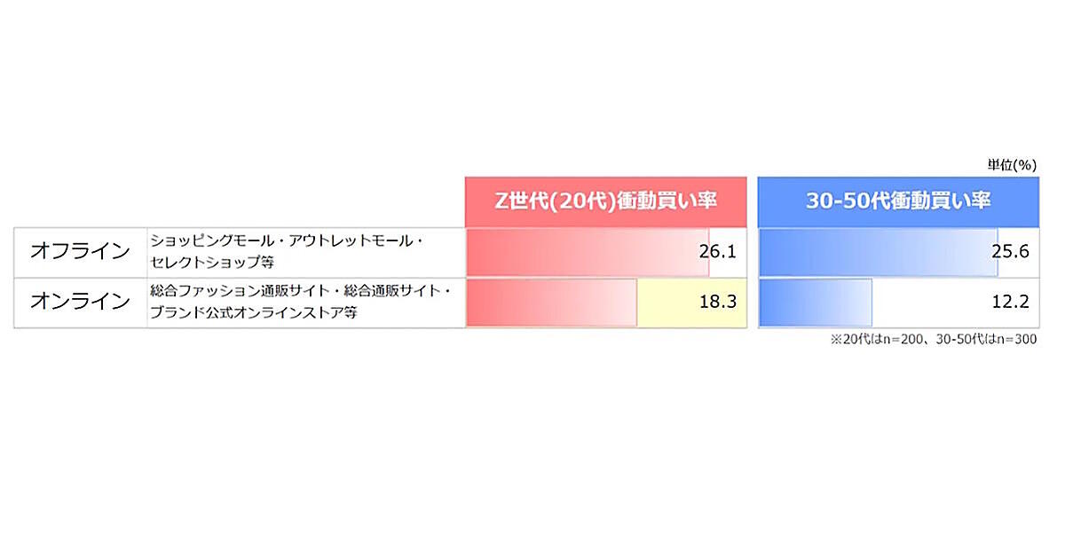 ファッション用品の購買場所ごとの衝動買い率を見ると、総合ファッション通販サイト、総合通販サイト、ブランド公式オンラインストアなどの「オンライン」でZ世代が18.3%、30~50代が12.2%だった。