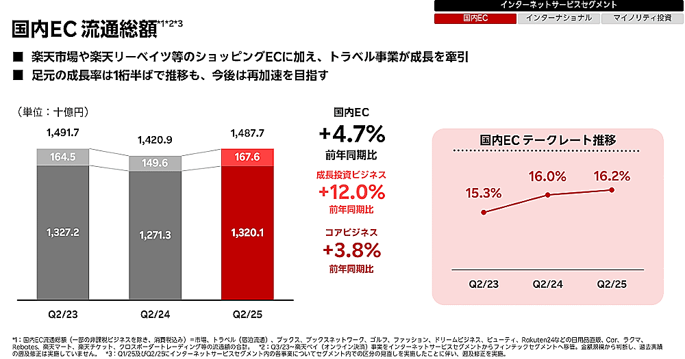 楽天グループの2025年1-6月期(中間期)連結業績における国内EC流通総額は2兆9184億円で前年同期比4.0%増だった。2025年4-6月期(第2四半期)単体では同4.7%増の1兆4877億円。
