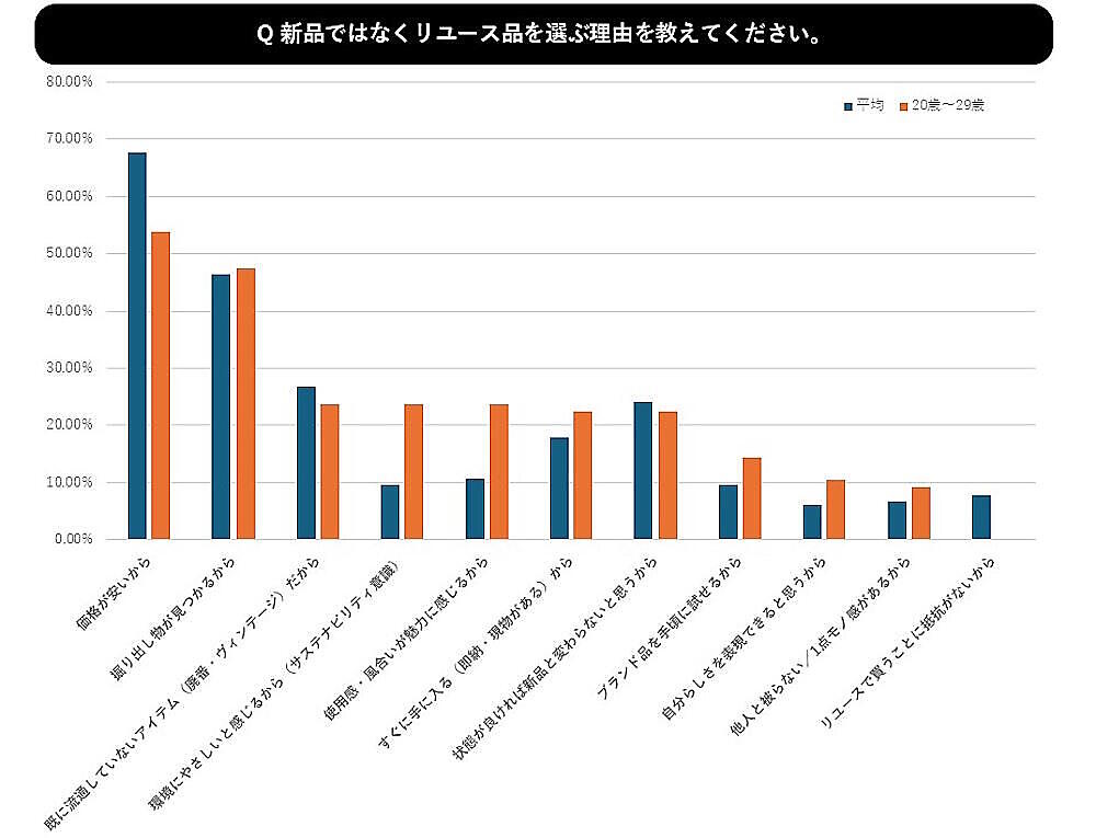 新品ではなくリユース品を選ぶ理由は、全体では「価格が安いから」が最も多く、約67%だった。これに続き、「掘り出し物が見つかるから」が約46%、「すでに流通していないアイテムだから」が約27%。