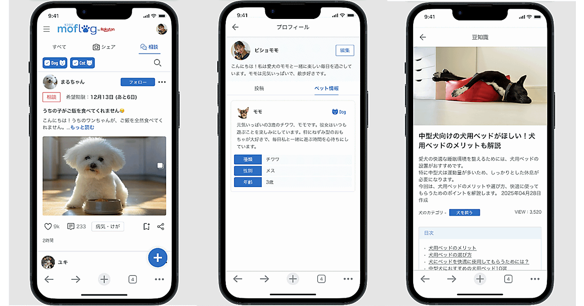 楽天グループは8月12日、ペットオーナー・ペット好きユーザー向けのソーシャルメディア「moflog(モフログ) by Rakuten」を開設した。