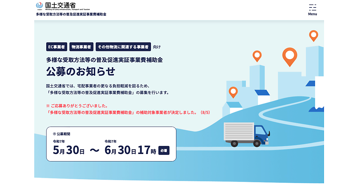 国土交通省は8月5日、宅配事業者の更なる負担軽減を図るための「多様な受取方法等の普及促進実証事業費補助金」の補助対象事業者を決定し、その取り組みを公表した。