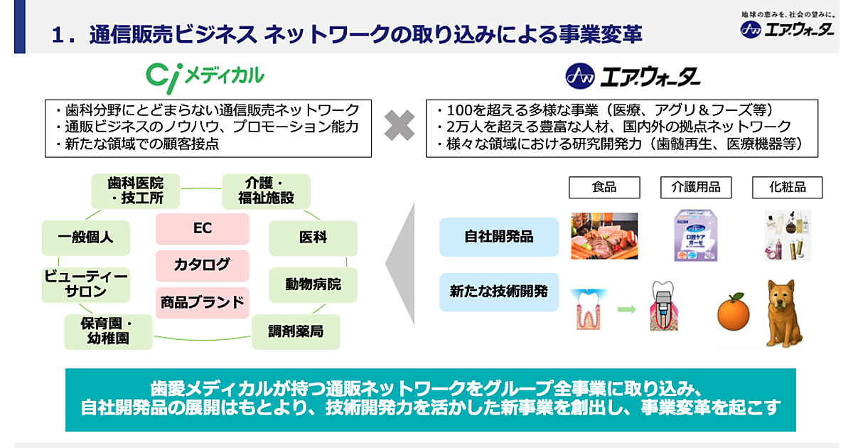 エア・ウォーターは歯愛メディカルの通信販売ネットワーク、通販ビジネスのノウハウやプロモーション能力、顧客接点をグループ全事業で取り込み、自社開発品の展開や、技術開発力を生かした新事業を創出し、事業変革を起こしていくという。