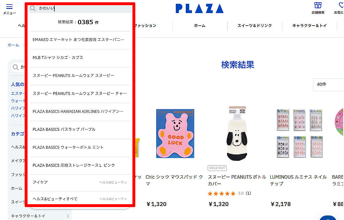 「PLAZAオンラインストア」で取り扱う商品は、すでにキャラクターやブランドイメージが確立されているものが多く、サイトに訪れたユーザーが固有名詞で検索して指名買いするケースも十分に想定されます。こうしたユーザーの利便性を高めるため、検索精度の改善やチューニングのサポートを行ってきました。