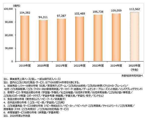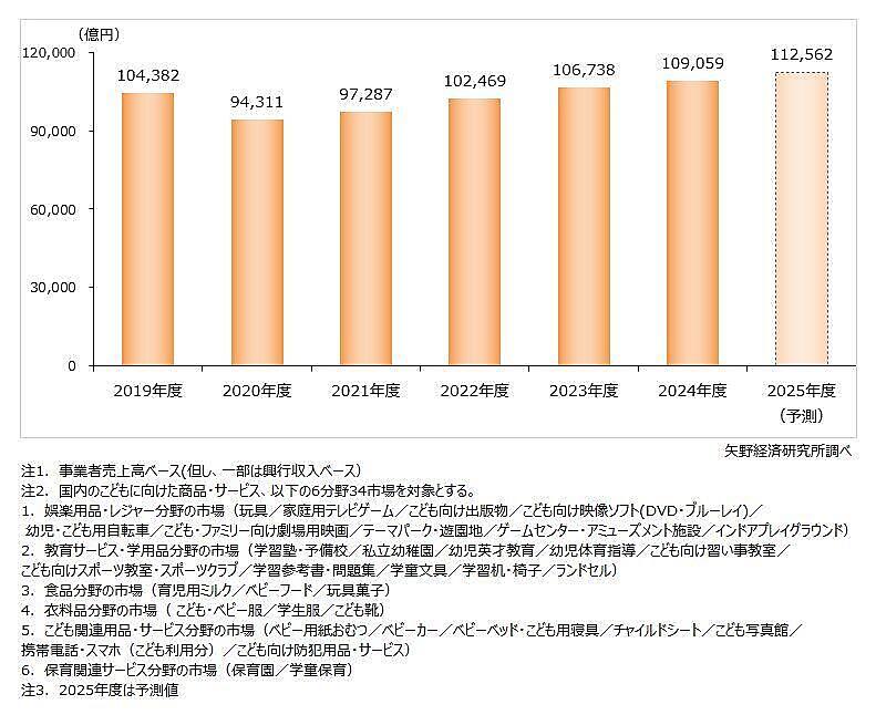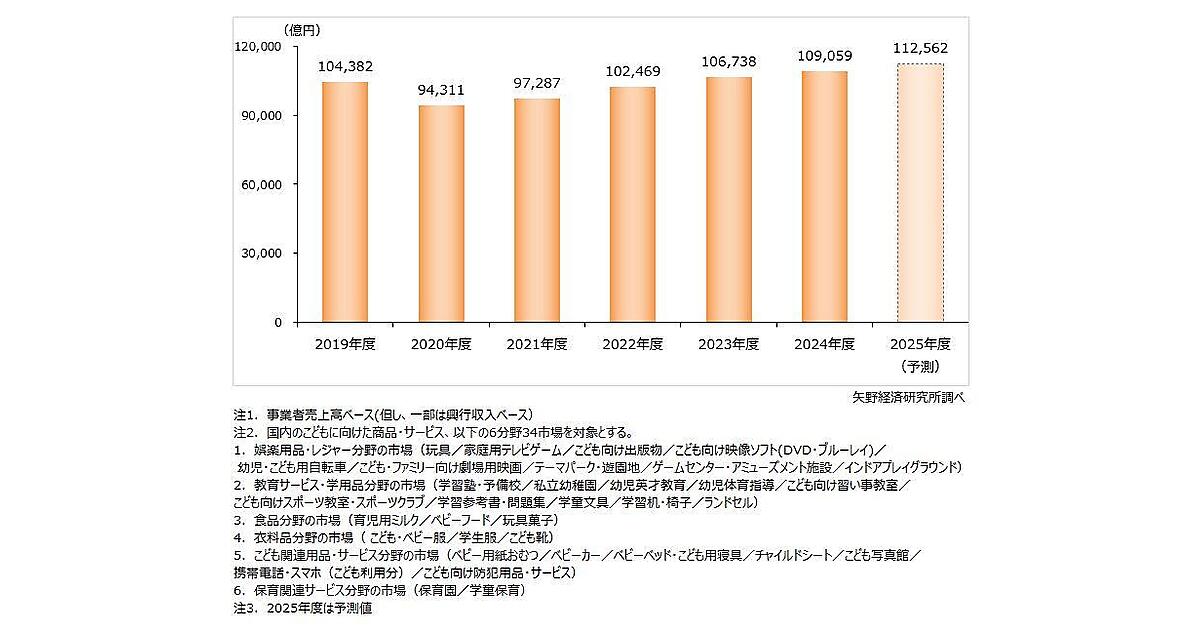 矢野経済研究所が公表した国内のこども関連ビジネス市場の調査結果によると、2024年度のこども関連ビジネス市場規模(6分野34市場計)は、事業者売上高ベース(一部は興行収入ベース)で前年度比2.2%増の10兆9059億円だったと推計した。