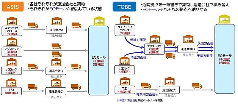PoCは2025年6月から8月現在にかけて実施。従前は各社それぞれが運送会社と契約し、ECモールへ商品を納品していたが、PoCでは各社の近隣拠点の商品を集荷し、運送会社で積み替え、それをそれぞれのECモールの物流拠点へ納品している。