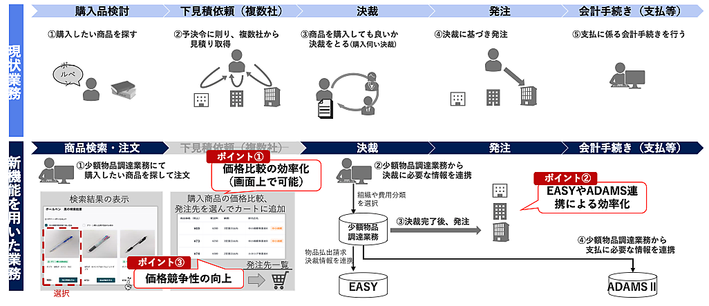 ただ、少額物品の調達は入札を行わないため電子調達システム「GEPS」の対象外で、年間約45万件に及ぶ調達業務が主に紙ベースだった。「少額物品販売業務」は、電子化を進めるために新たに「GEPS」の新機能として開発した府省庁共通の少額物品販売調達プラットフォーム。「GEPS」利用の対象外だった少額随意契約(300万円未満)の物品調達を対象としている。種類が多く調達に手間のかかる間接資材調達においても、商品の検索から承認‧電子契約、発注から決裁までの一連の手続きをオンラインで行うことができ、調達業務の効率化につながるという。