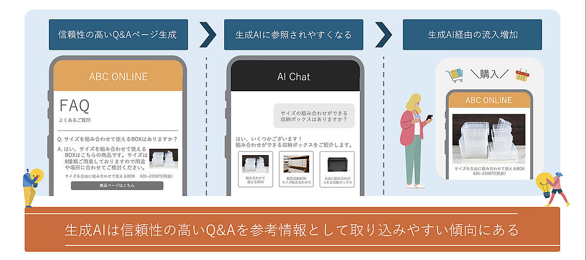 生成AIは会話のなかで外部検索を行う。そのため、生成AIは事前に質の高いQ&Aを取り込んでおく必要がある。ECサイトで信頼性の高いQ&Aページを作成することで、AIの回答のなかに自社商品が表示される可能性が高くなる。