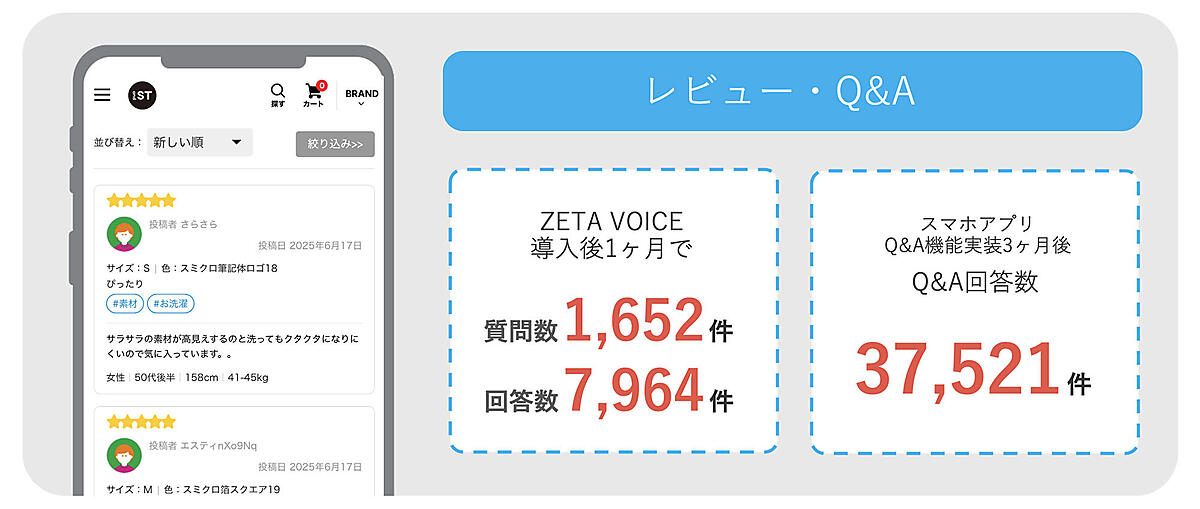 ZETAのソリューションは、さまざまなジャンルのECサイトに導入されており、すでに実績をあげている。たとえばあるファッションECサイトでは、「ZETA VOICE」導入後1か月で質問数が1652件、回答数が7964件に達した。