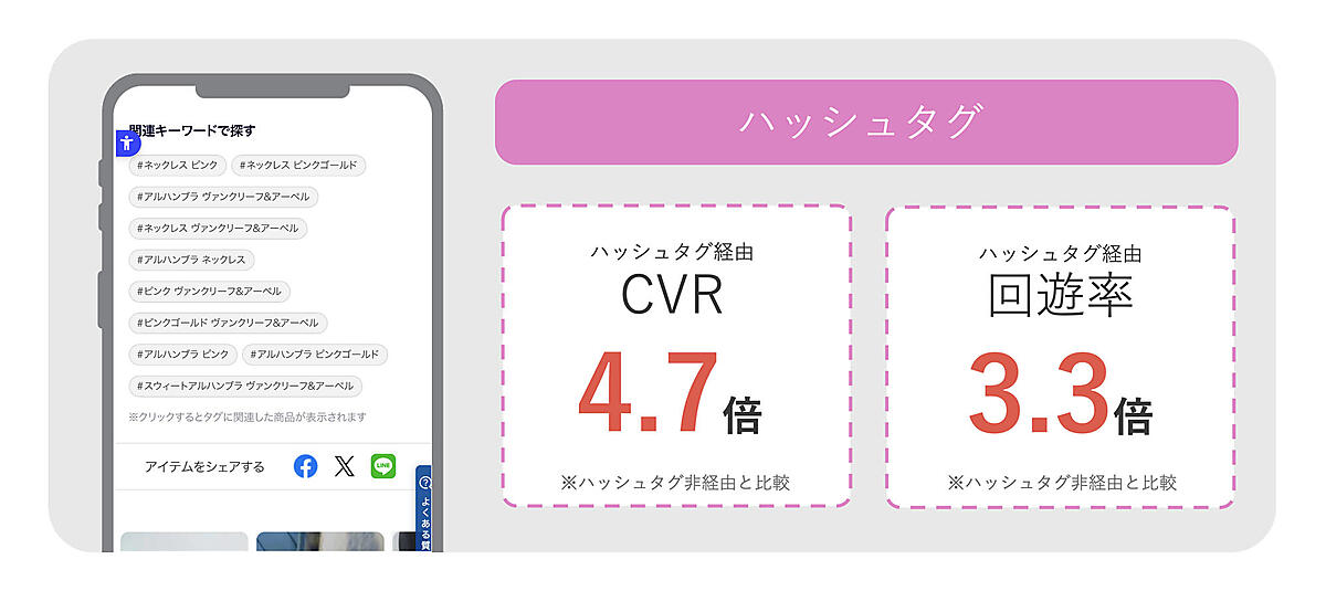 実際、あるサイトではハッシュタグを経由したユーザーのCVRは、ハッシュタグを経由していないユーザーの4.7倍、回遊率は3.3倍にもなったという。ハッシュタグはアクティブなユーザーを見分けられるツールでもあるのだ。