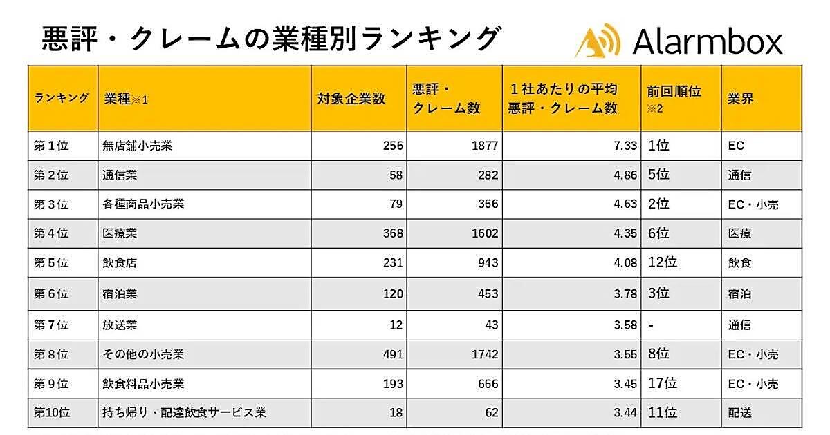 アラームボックスが1万1230社を対象に調査した「2025年上半期 インターネット上で悪評・クレームが多い上位10業種」によると、悪評・クレームの投稿が最も多い業種は通販・EC事業が該当する「無店舗小売業」だった。不満は「注文後に連絡が取れない」「返信が遅い」「返品・交換がスムーズに進まない」といった“対応面”に関する内容が特に多いという。