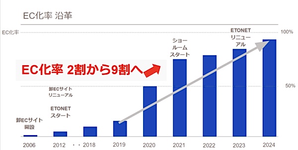 2019年頃からEC化率向上の取り組みを加速し、2021年にはEC化率が大きく向上した。EC化率は従前の20%から90%への急拡大に成功した。
