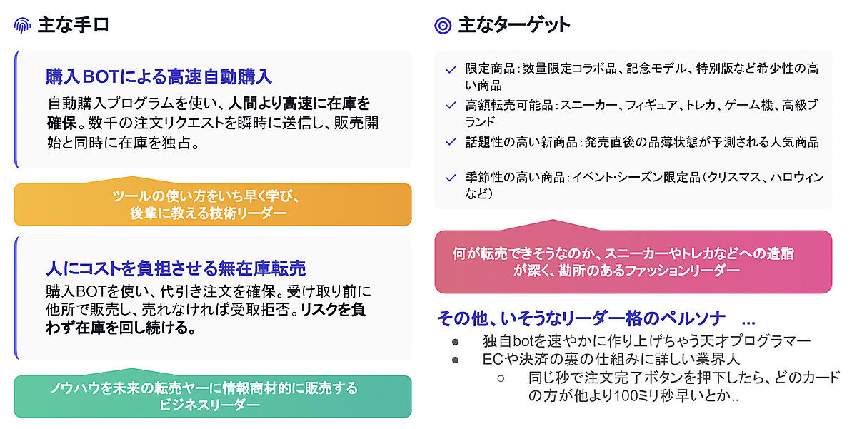 購入BOTを使う「技術リーダー」たちは、新しいツールが出るといち早く試し、その知識を他の転売ヤーに共有。転売ノウハウを情報商材として販売する「ビジネスリーダー」もおり、転売ビジネスを体系化して広めている。さらに、転売対象を見極める能力に優れた「ファッションリーダー」も存在する。彼らはスニーカーやトレーディングカードなどコレクターズアイテムの領域に精通している。