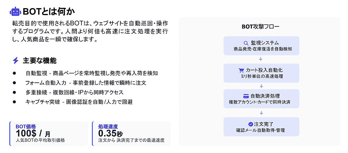 ここで転売ヤーが利用するBOTについて説明する。BOTとはWebサイトを自動巡回し動作するプログラムのことだ。手動操作の何倍も速く注文処理を行い、人気商品を瞬時に確保できるという。