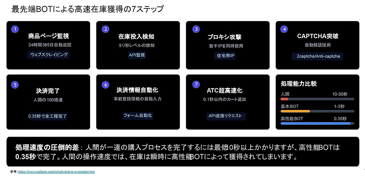 転売ヤーの購買プロセスを整理する。まず商品ページを常時監視し、新商品の発売や再入荷を自動的に検知する。この監視はミリ秒単位で行われ、高性能なBOTを用いた競争が繰り広げられている。1ミリ秒の差が数百ドルの利ザヤにつながるため、技術競争が激化している。
