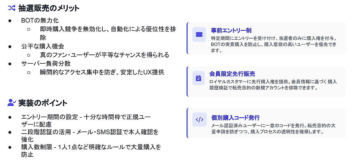 抽選販売には猶予期間が設定されているため、高速性を誇るBOTがその速さを発揮できず、スピードの優位性を無効化できる。また、BOTの有無に関係なく、真のファンやユーザーが公平に購入の機会を得られる仕組みであり、平等性が確保できる。また、抽選販売は瞬間的なアクセス集中が発生しないため、サーバー負荷の分散にも寄与する。