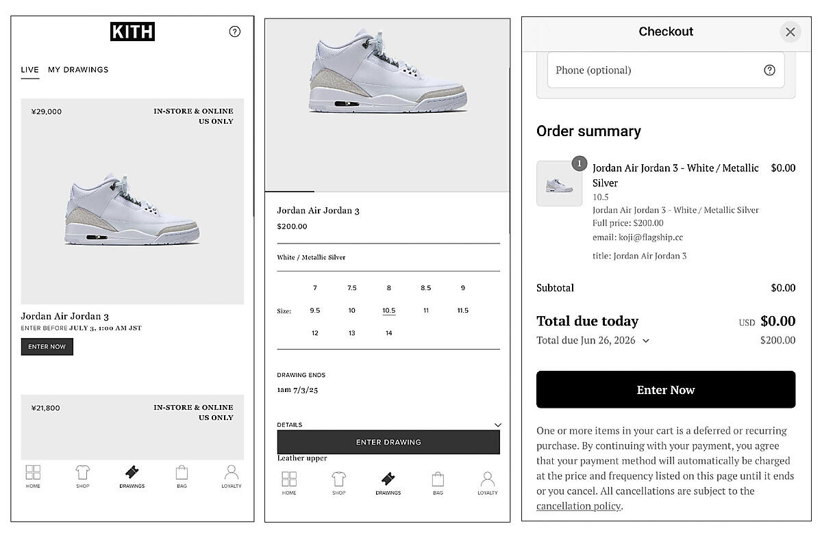 米国のアパレルブランド「KITH(キース)」では抽選販売を採用しており、ネイティブアプリに抽選機能のボタンを配置している。このボタンを開くと抽選対象商品が一覧表示され、ユーザーはサイズを選んで抽選に申し込む。この段階では費用は発生せず、当選した場合に自動的に決済が行われる仕組みだ。