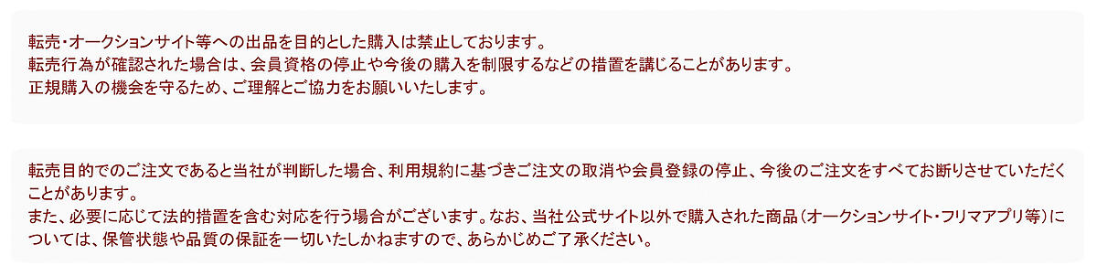 このようなロイヤリティプログラムで高いランクのユーザーに特別な特典を与えることで、継続的な購入を積み重ねる必要が生まれる。日常的に商品を購入している本当の顧客が有利になる施策であり、複数のアカウントを使って購入する転売ヤーの活動を抑制できる。