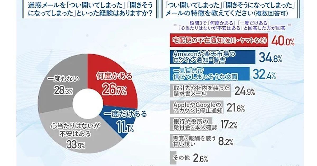 テクノルが実施した「生成AIを悪用した迷惑メール被害とその対策」に関する実態調査によると、約4割が迷惑メールを「つい開いてしまった」「開きそうになった」といった経験があると回答した。 開封してしまった迷惑メールの主な特長は、「宅配便の不在通知」「Amazonや楽天市場のログイン通知・警告」など。調査対象は回答時に5年以上オフィスワークをしている会社員であると回答した23~59歳のモニター1020人。調査期間は2025年8月14~15日。