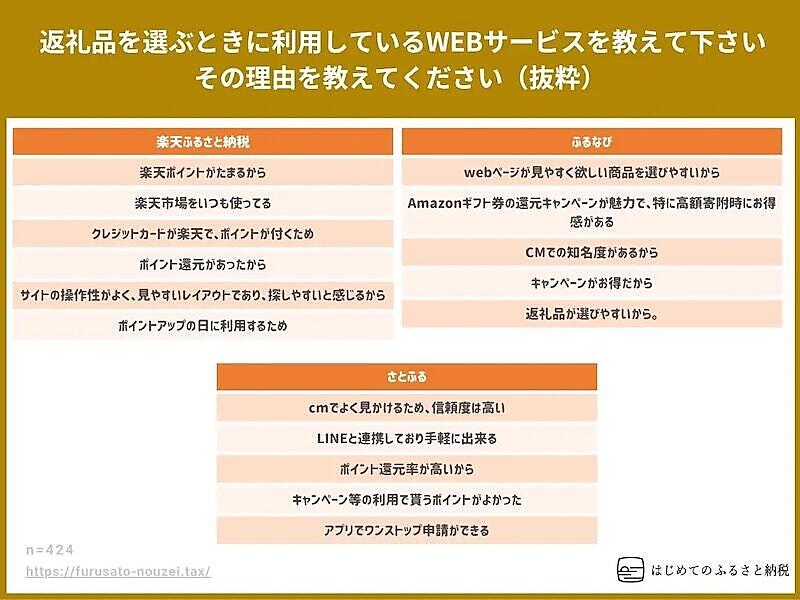 利用しているWebサービスを使う理由を聞いたところ、利用者が多い「楽天ふるさと納税」「ふるなび」「さとふる」については次のような意見があった。
