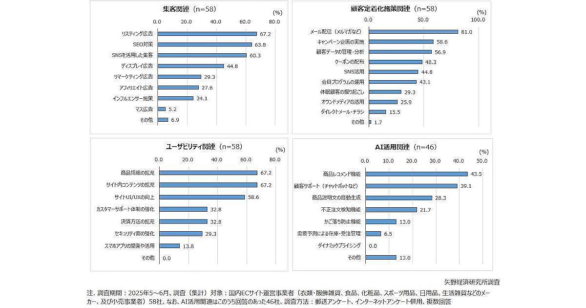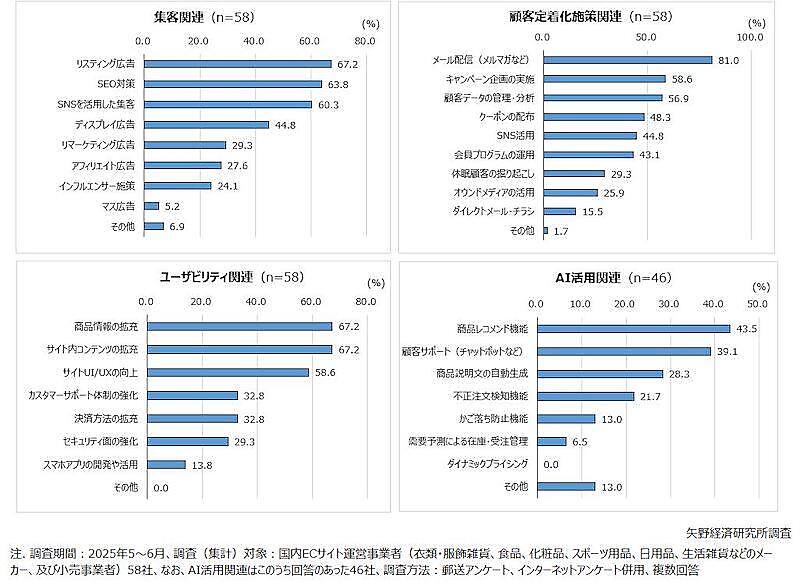 矢野経済は2025年5~6月に国内のECサイト運営事業者58社(衣類・服飾雑貨、食品、化粧品、スポーツ用品、日用品、生活雑貨などのメーカー、小売事業者)に対し、EC(インターネット通販)事業における消費者への施策や運営に関する取り組みについて、法人アンケート調査を実施。
