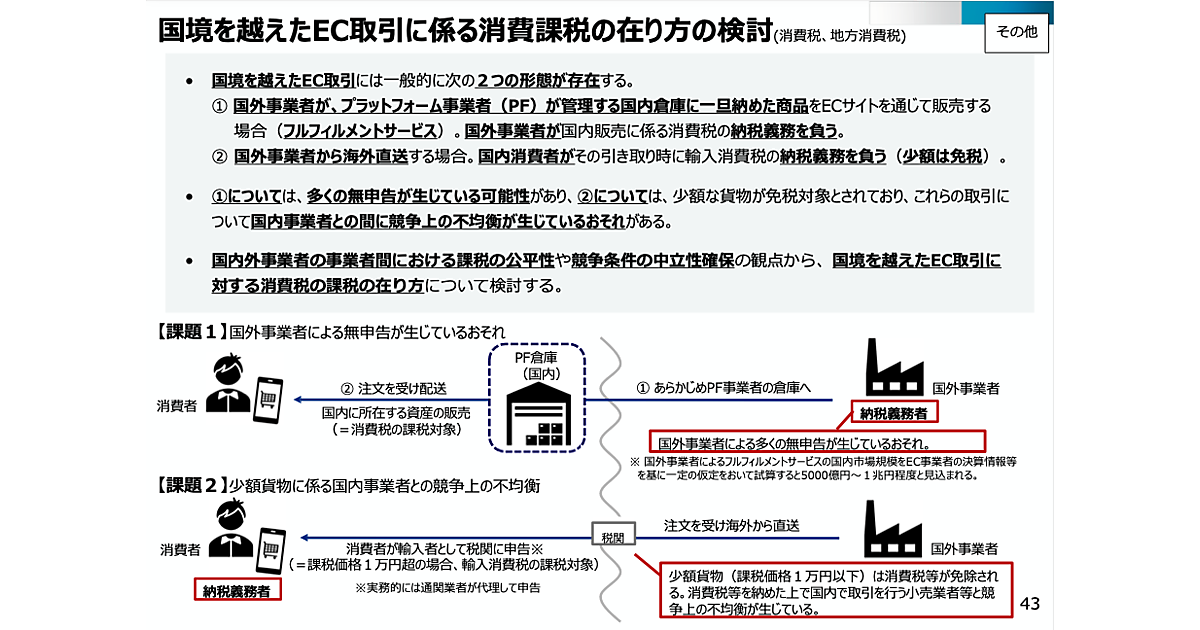 2つ目は、国外事業者から海外直送する場合。国内消費者がその引き取り時に輸入消費税の納税義務を負う。少額な貨物が免税対象とされており、これらの取引について国内事業者との間に競争上の不均衡が生じている恐れがあるとした。