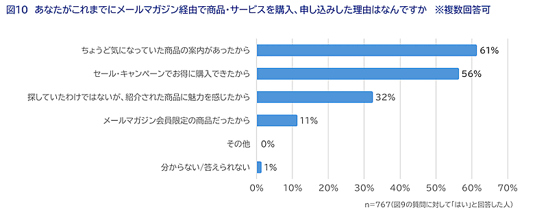 メルマガ経由での購入経験者に対してその理由を聞いたところ、61%が「ちょうど気になっていた商品の案内があったから」を選択。次いで56%が「セール・キャンペーンでお得に購入できたから」を選択した。