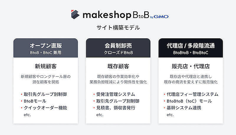SaaS型のEC構築プラットフォーム「makeshop byGMO」をベースに、導入社のBtoB-ECモデルに最適な機能を、オプションやカスタマイズを組み合わせて提供する。