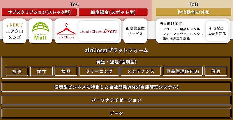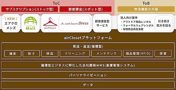 また、「airCloset」を通して循環型プラットフォームを構築。発送・返送に対応する循環型物流の仕組み、自社開発WMS(倉庫管理システム)、顧客・商品に関する各種データを管理するシステム、それらのデータを活用したパーソナライゼーションの仕組みを構築している。