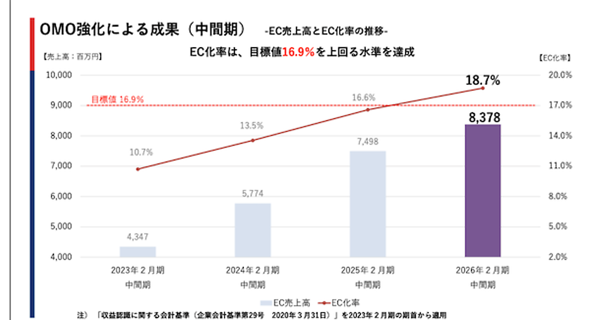 「サイクルベースあさひ」を運営するあさひの2025年3-8月期(中間期)におけるEC売上高は、前年同期比11.7%増の83億7800万だった。EC化率は同2.1ポイント増の18.7%で、OMO強化によりEC化率が拡大した。