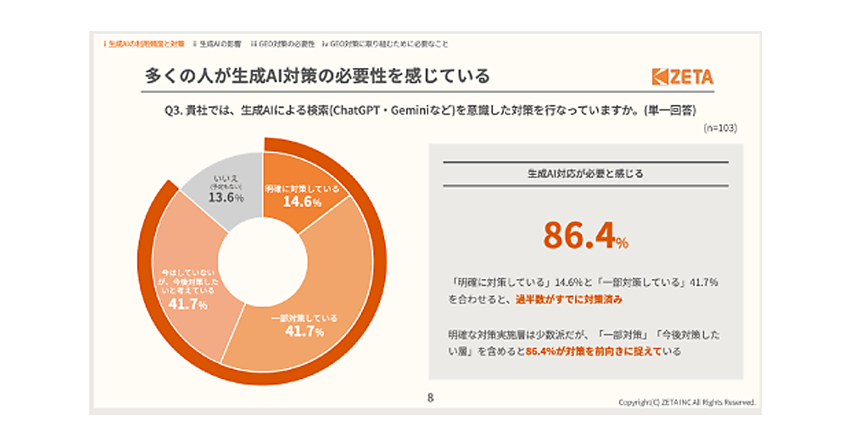 ZETAが実施したアンケート調査「GEOの認知・関心度」によると、回答者の約9割が「生成AIを意識した対策が必要」と回答した。調査期間は2025年8月19日~20日、調査対象はマーケティング・PR関連業務を担当している男女103人。