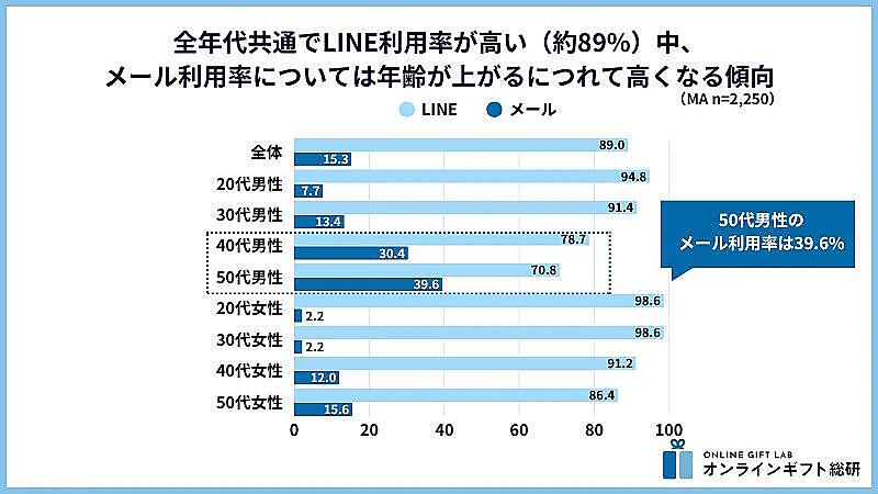 「ギフトモール オンラインギフト総研」を運営するギフトモールが実施した、ソーシャルギフト利用経験者に特化した実態調査によると、ソーシャルギフトで使用したツールは全年代で「LINE」が約9割だった。メールの利用率は年齢が上がるほど高くなっている。価格帯を見ると、50代男性では高額ギフトを選ぶ傾向が見られた。