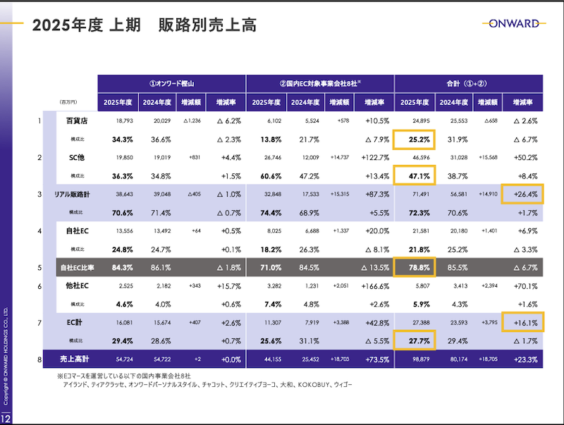オンワードHDの2025年中間期のEC売上は273億円で16%増、EC化率は27.7%