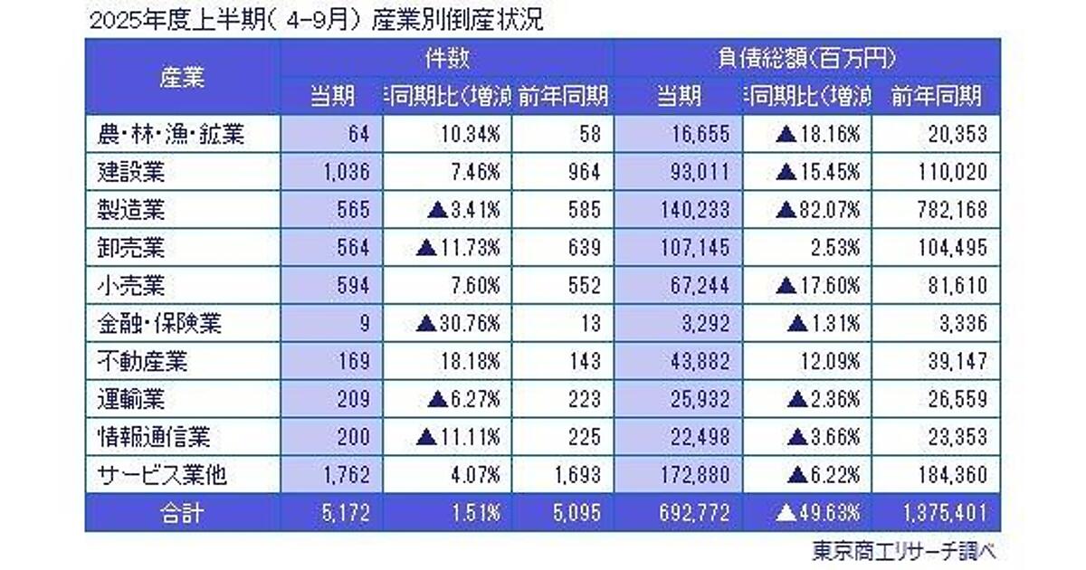 倒産件数は上半期では4年連続で増加し、2013年(5505件)以来の水準になった。負債総額は上半期では3年連続で前年を下回り、4年ぶりに1兆円を割り込んだ。2024年は負債6413億円などの大型倒産が発生したが、2025年度の最大の倒産は脱毛サロンのMPHの260億円。また、負債10億円以上は同13.4%減の103件、5億円以上10億円未満は同12.8%減の122件といずれも減少した。